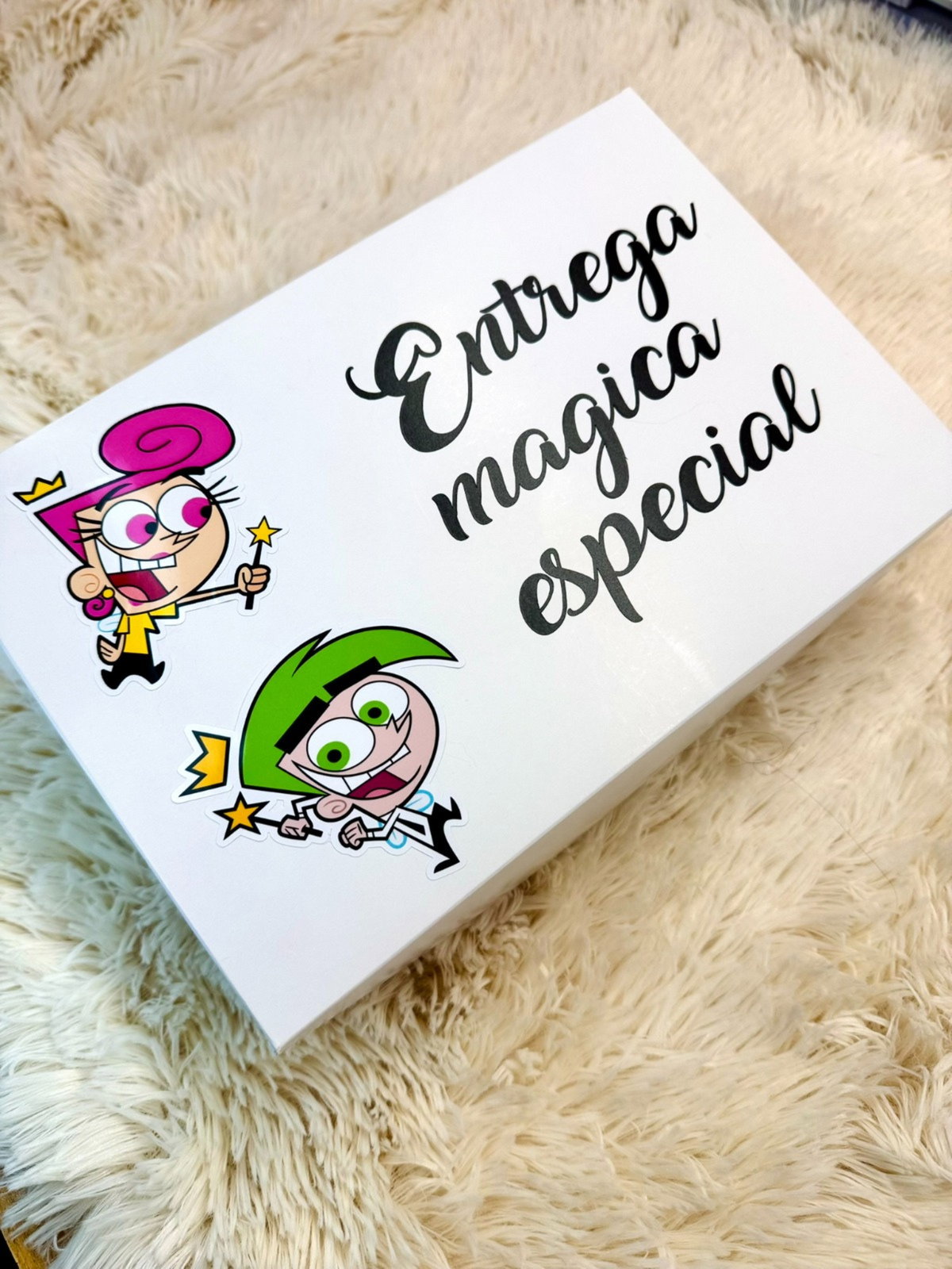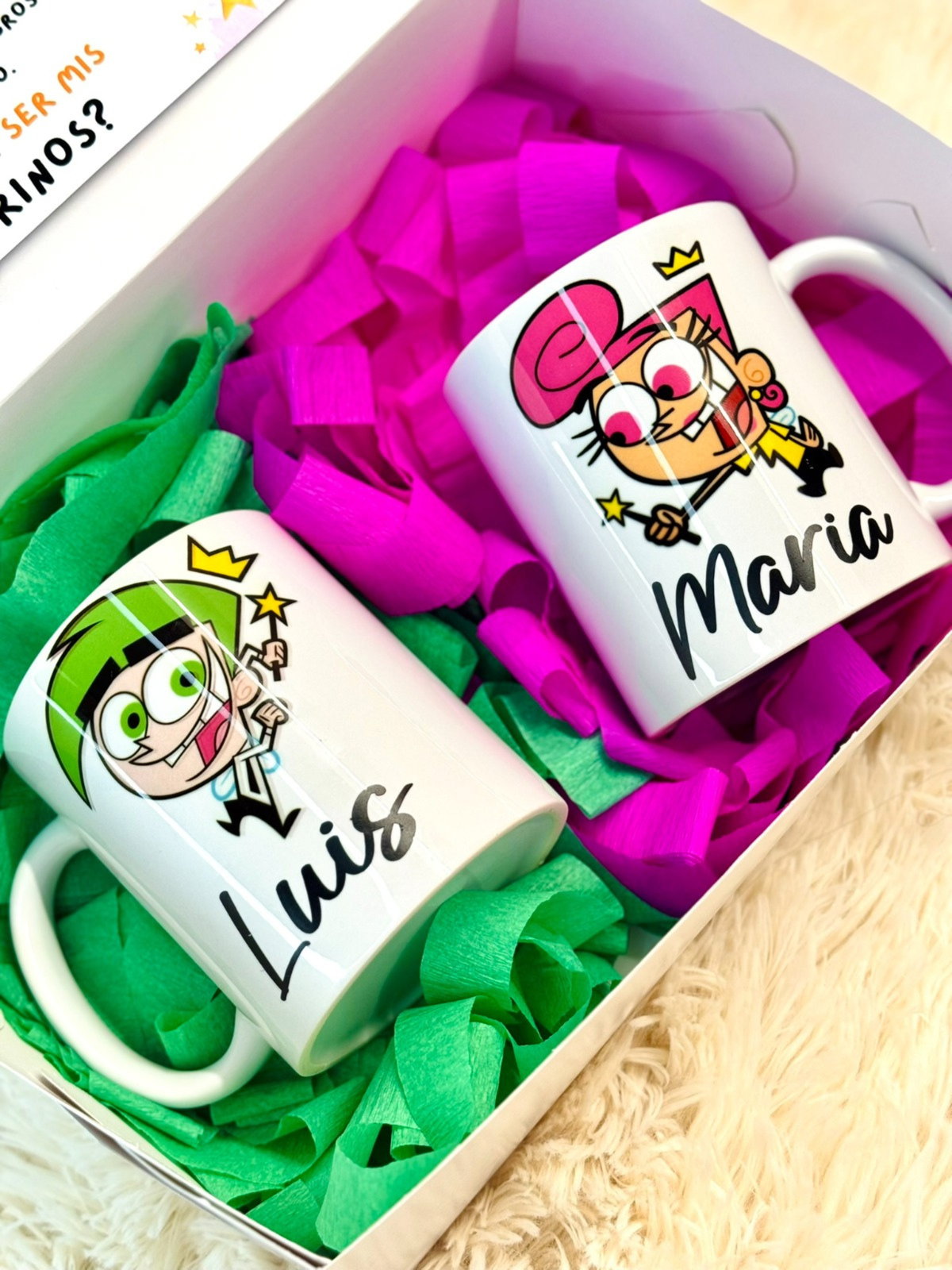 caja personalizada con vinilo en la tapa+ interior tarjeta con dedicatoria.incluye dos tazas personalizadas con los personajes y nombre de los padrinos.-medidas de la caja 26x18x10 cm.