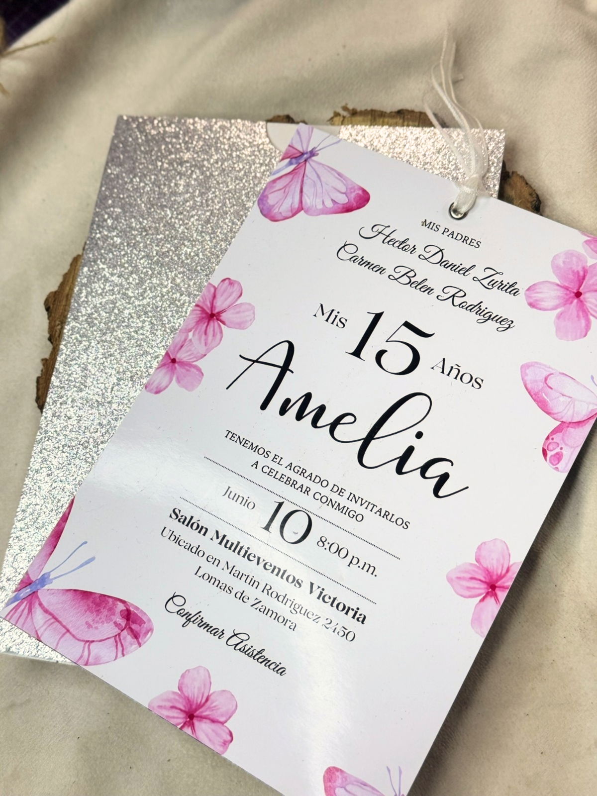 Invitación con sobre estilo pocket perlado+tarjeta personal que puede ser con ojal.
