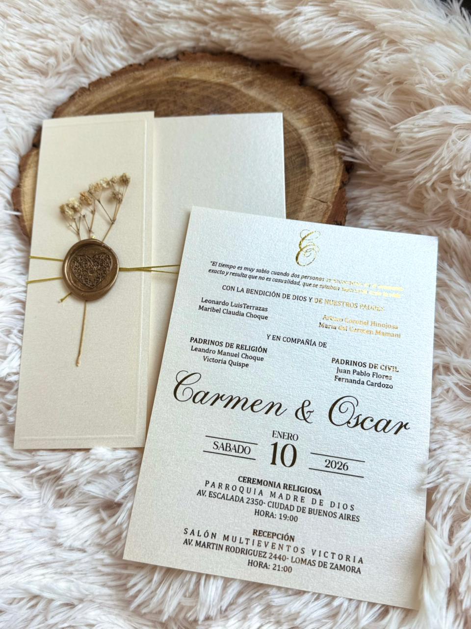 Invitacion para boda-Medida 13x18-Sobre perlado-Tarjeta de invitacion con FOIL-Hilo Dorado-Flores secas-Sello Lacre