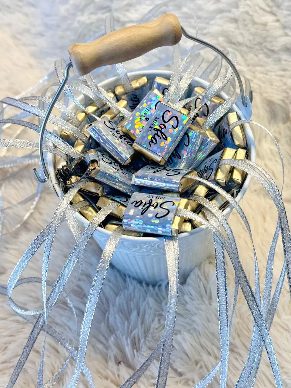 balde de zinc de aprox. 12x12 icluye 20 cintas con chocolates. 19 de las cuales son perdedoras y 1 ganadora con un anillo en acero quirurgico